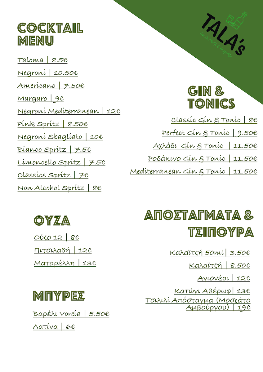 The menu at Tala’s Local Meze & Aperitivo feels carefully curated to showcase Greek flavors through simple yet thoughtful combinations, making it ideal for sharing and slow dining. Dishes like Πατατοσαλάτα and Ψωμί set a comforting foundation, offering familiar tastes that prepare the palate for more expressive plates. The richness of Πανσέτα pairs naturally with the freshness and balance found in spreads such as Χούμουσ, while Ταλιάτα adds a refined, protein-focused option that elevates the overall selection.